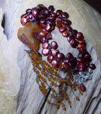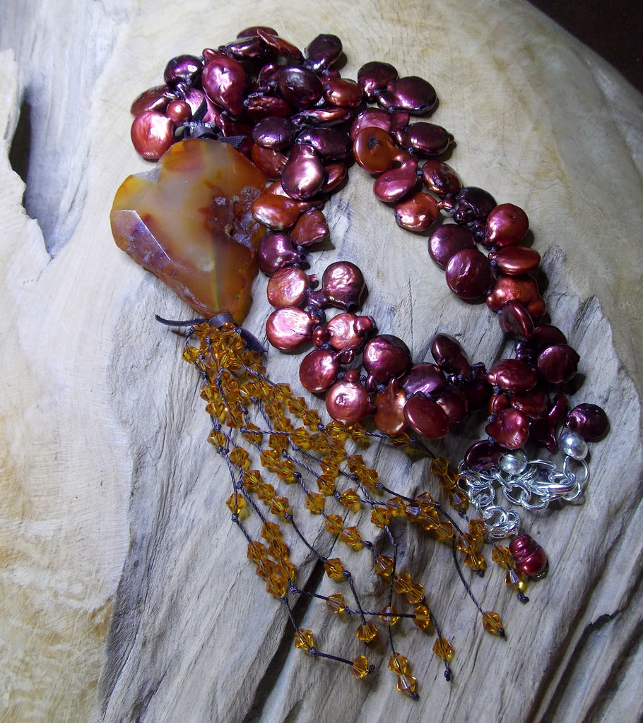 A nice slice of freeform (looks like a heart) cognac Agate pendant with a little bit of drusy; cognac Swarovksi fringe/tassel