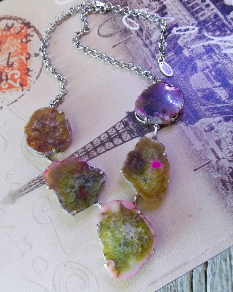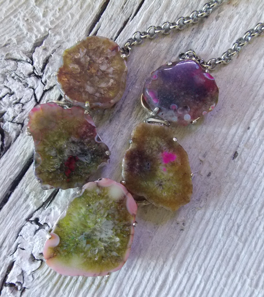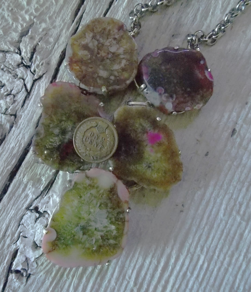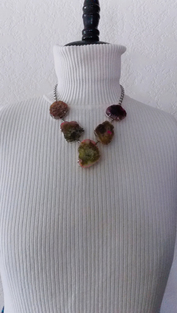 Gorgeous pinks and greens on this piece with five silver-plated clad Quartz slices with a little bit of matrix, suspended on rolo chain; center Quartz slice is the pendant