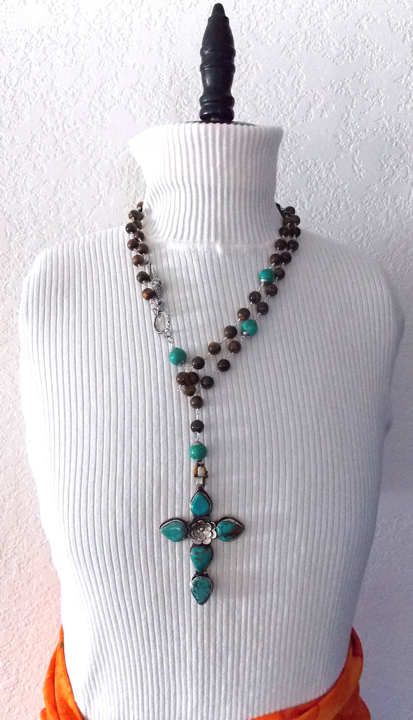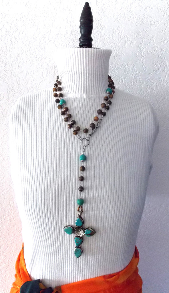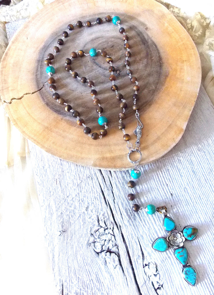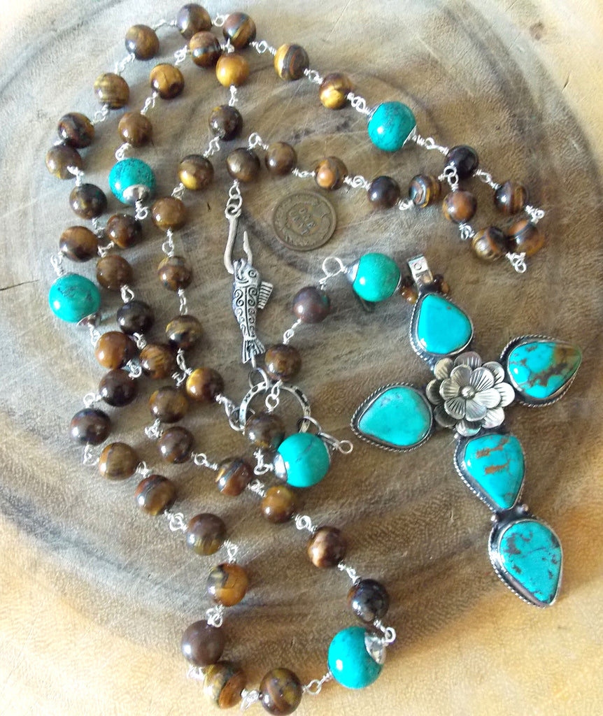 Beads are silver-filled wired; Turquoise beads have silver-tone caps; Tiger’s Eye beads are wire wrapped