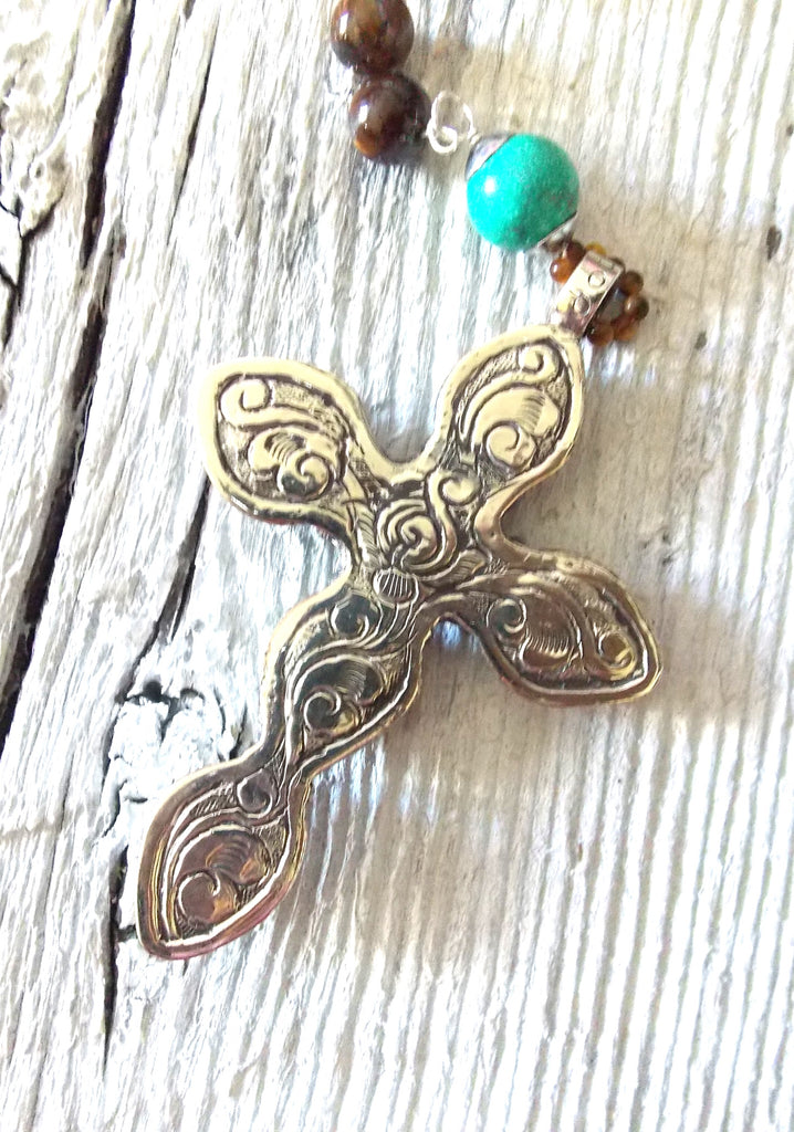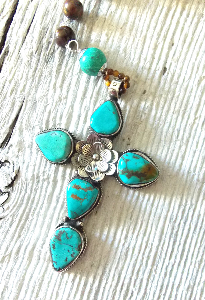 Large Tibet silver-clad Turquoise Cross with carved flower center; backside repousse floral vines