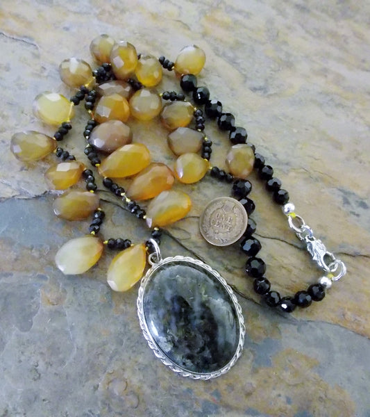 Hand-knotted strand of Honey Chalcedony faceted briolettes, Black Spinel faceted rondelles and black faceted Swarovski rounds