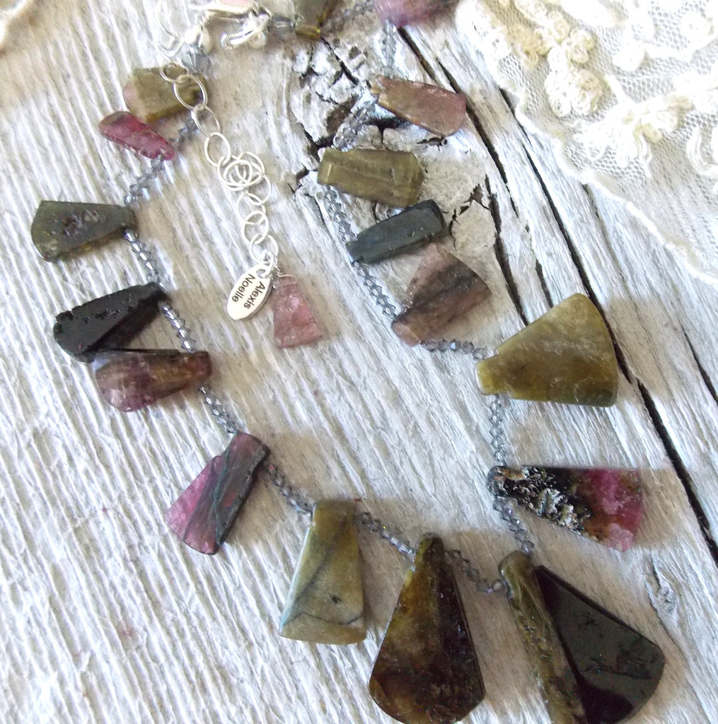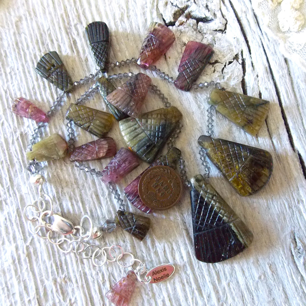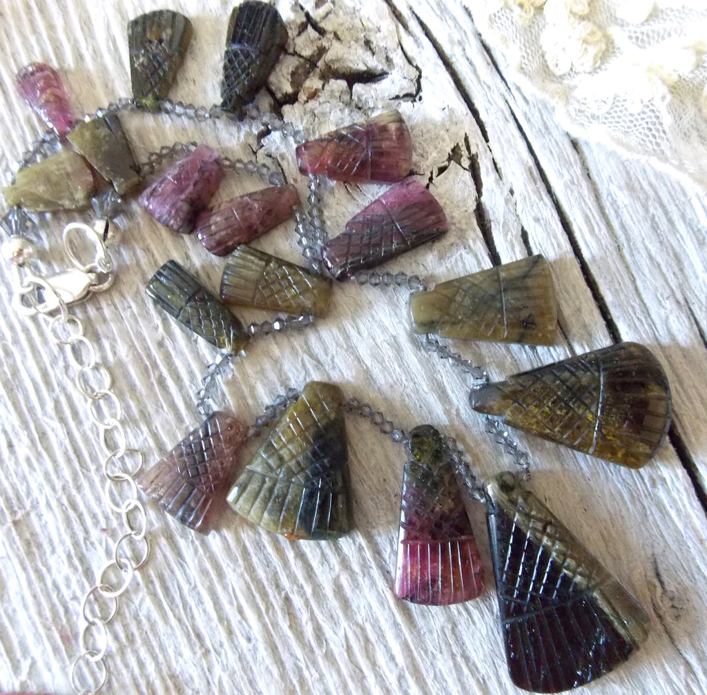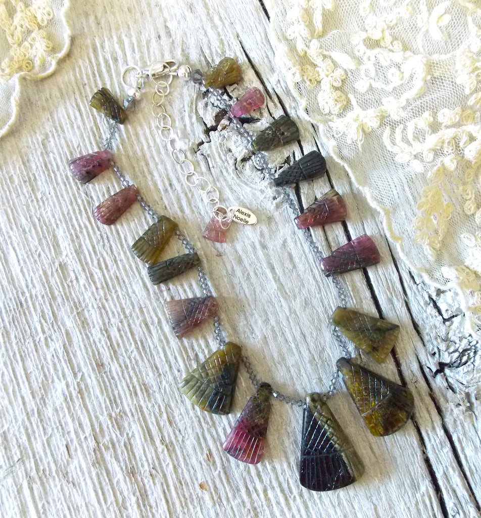 Watermelon Tourmaline hand-cut trapezoid wedges: double your smiles – one side of the stones are hand-etched, the other side are smooth (shows some dents and dings from the cuts); separated by petite Swarovski crystals; graduated sizes; hand-knotted