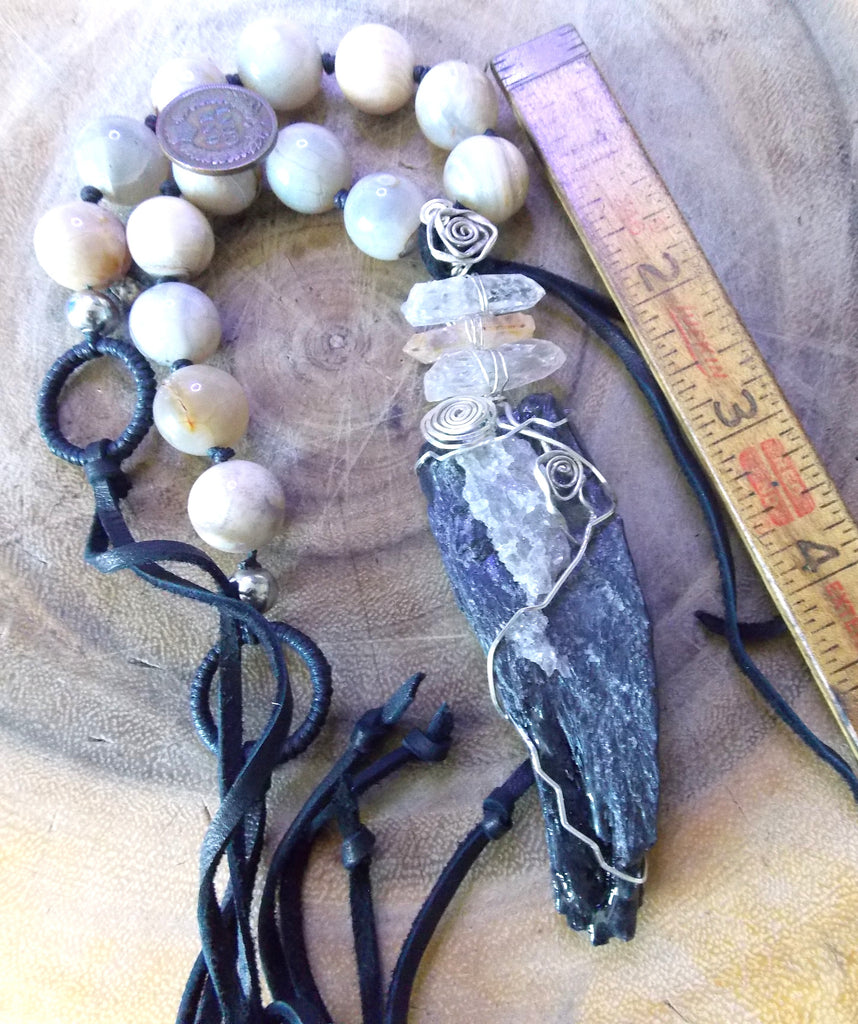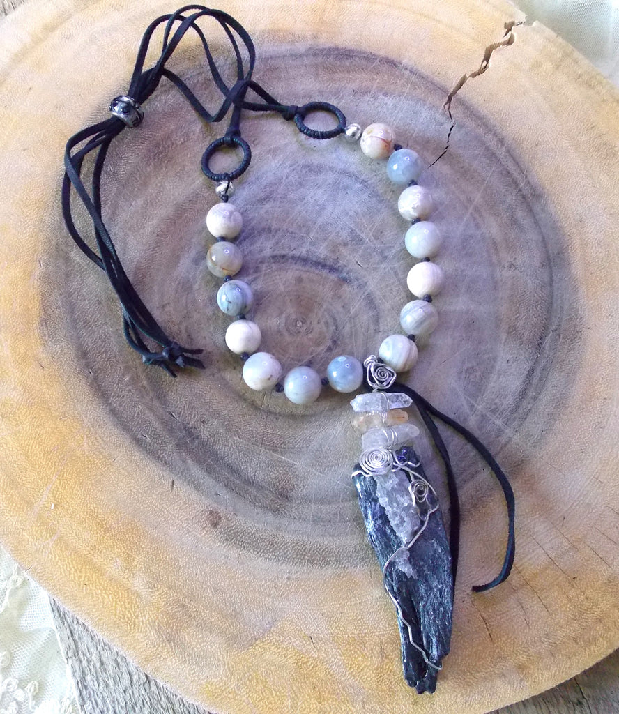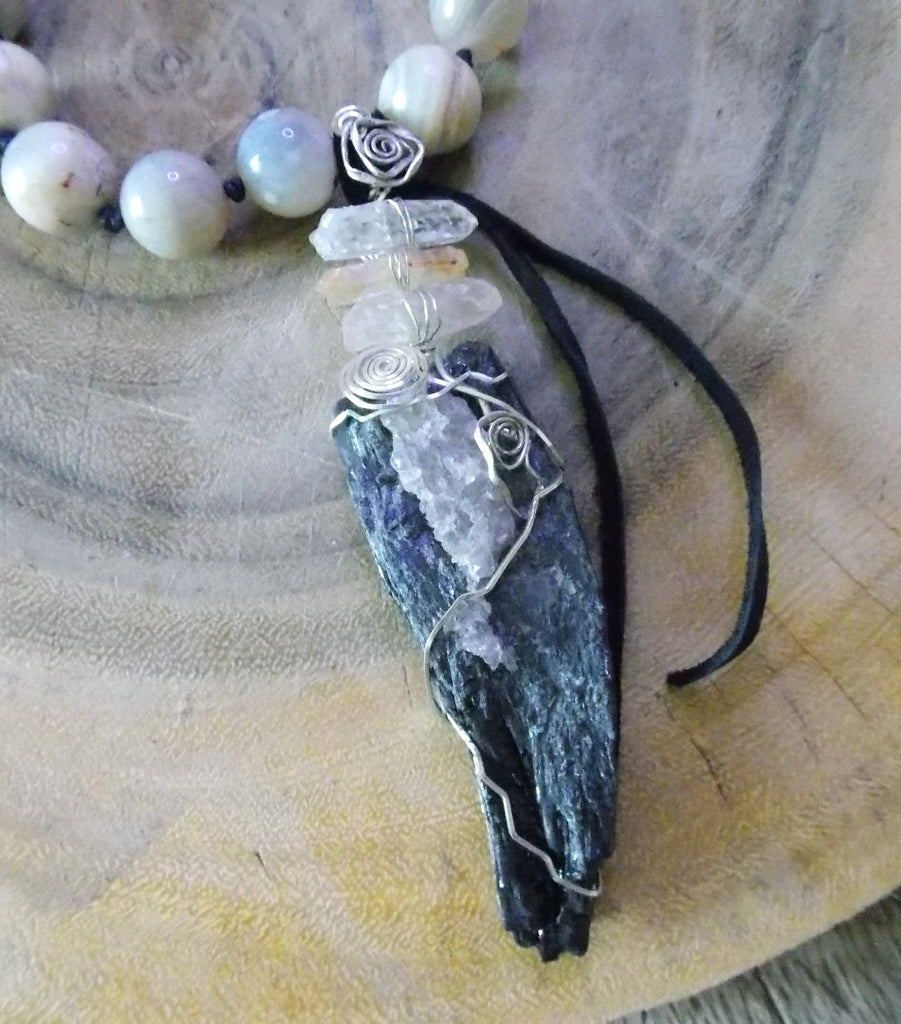 A wire-wrapped trio of crystal points with their bits of natural inclusions, suspends the Kyanite spear