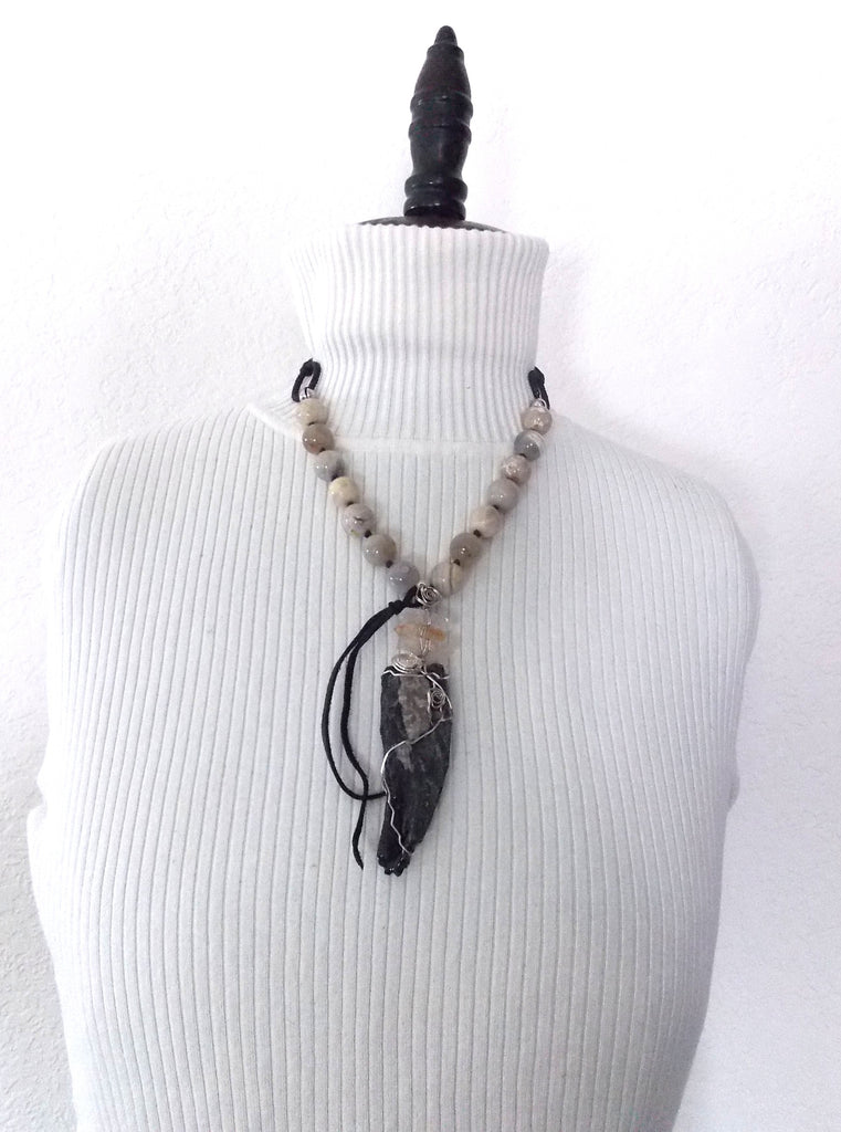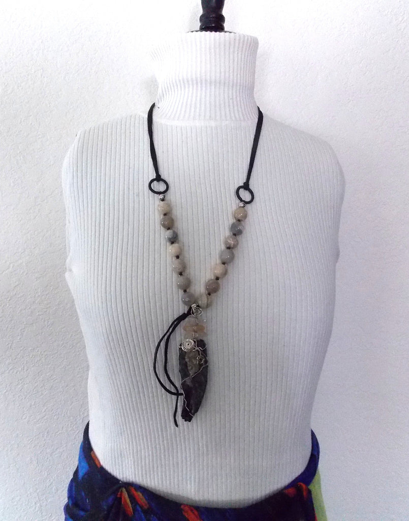 A hand-knotted waxed cotton strand of Botswana Agate onto waxed cotton wrapped rings onto black deerskin leather
