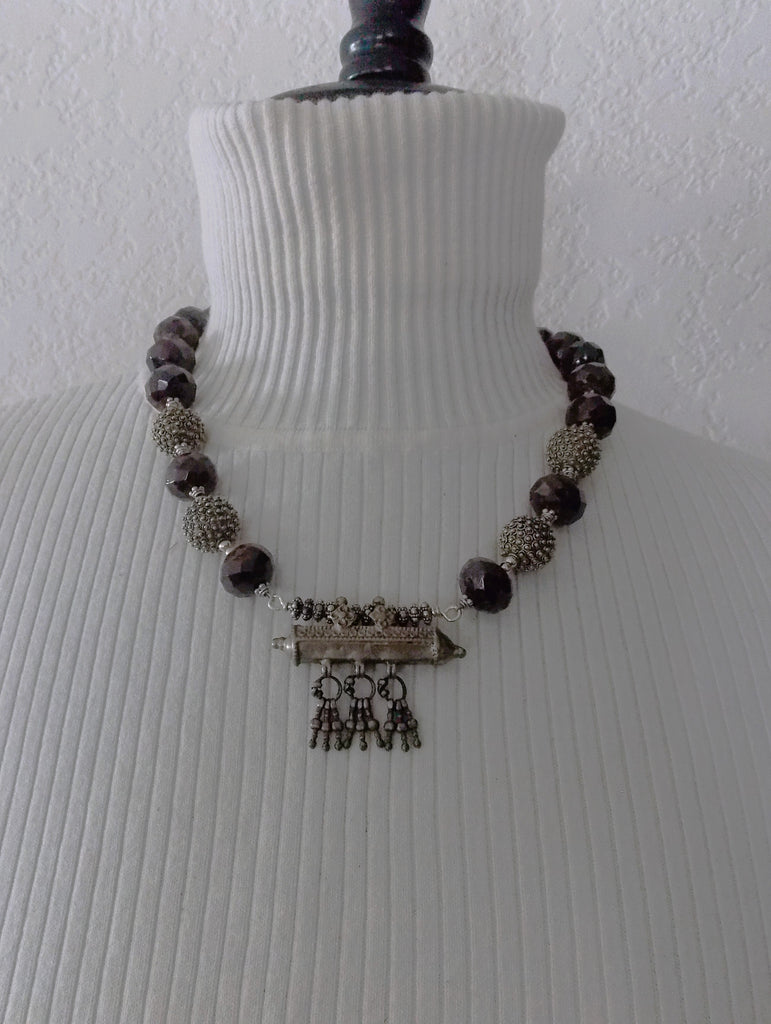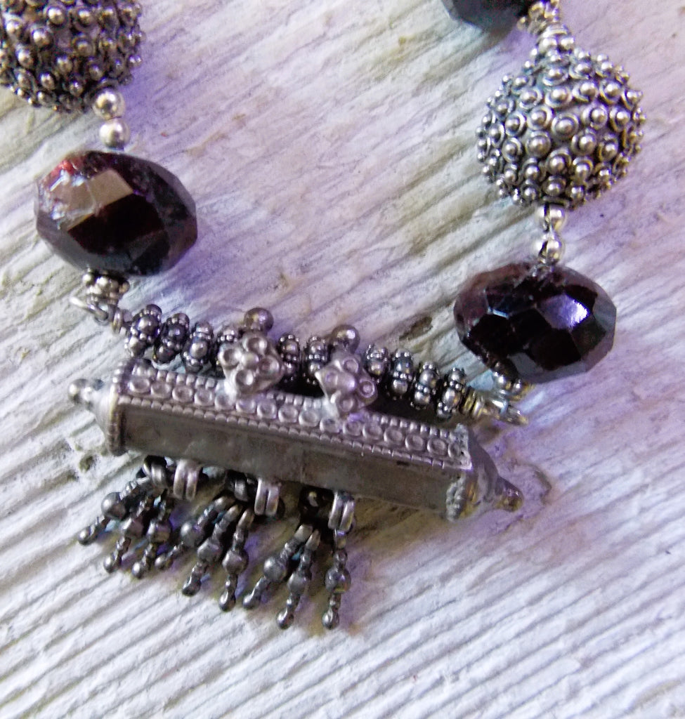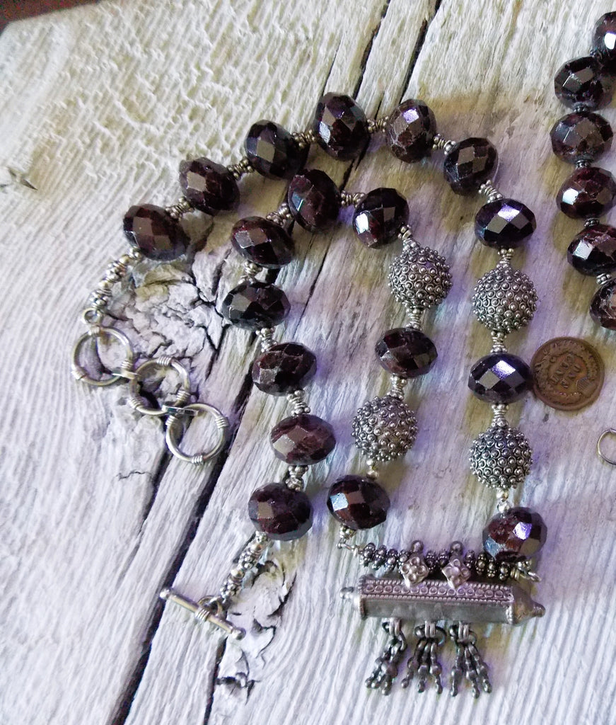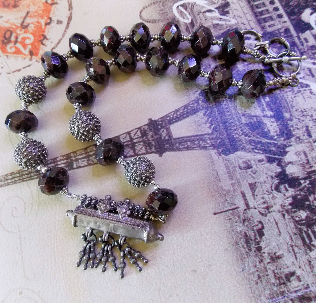 Large, faceted Pyrope (deep red) Garnets and textured round Sterling Silver beads; each bead end with Sterling Silver caps