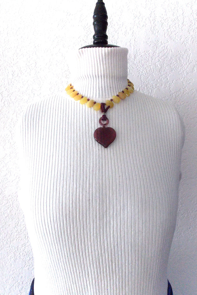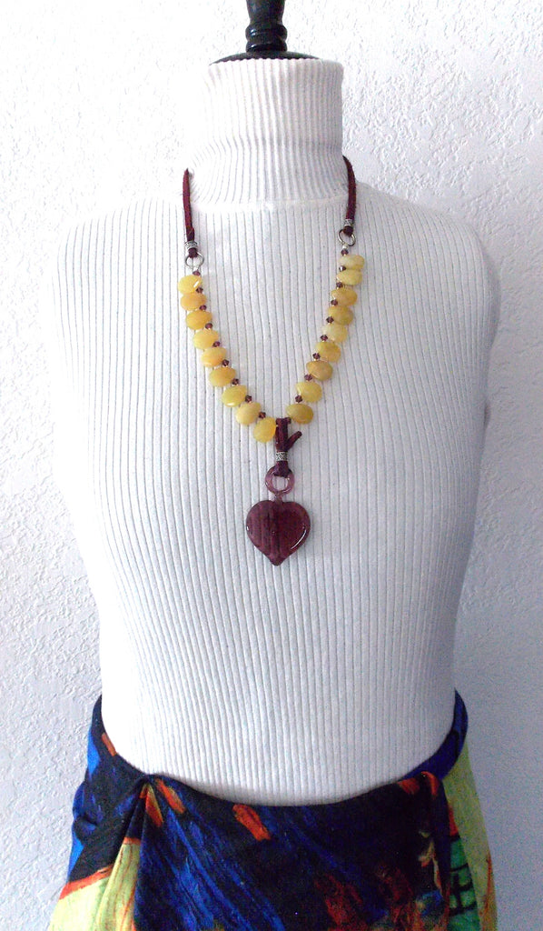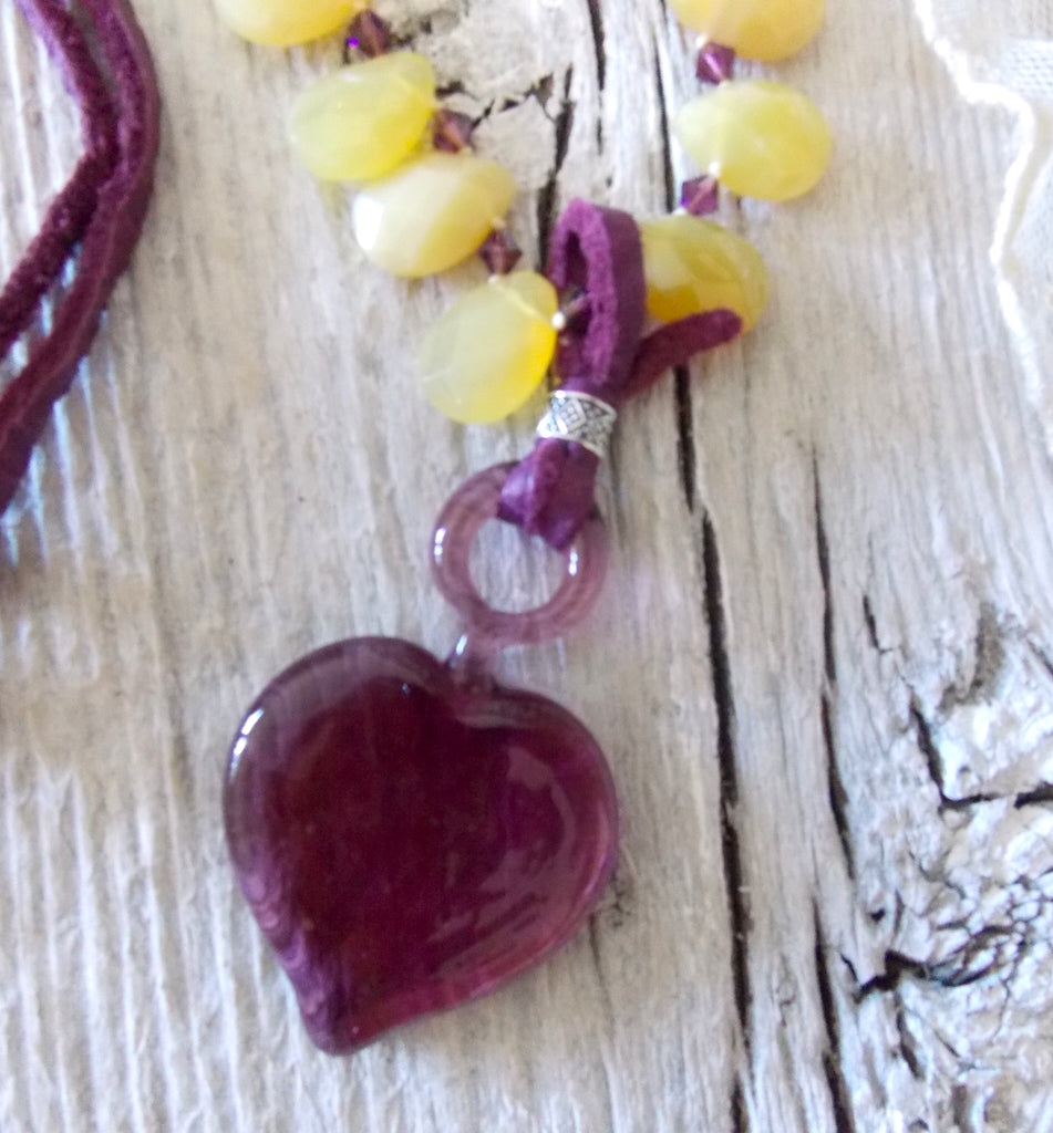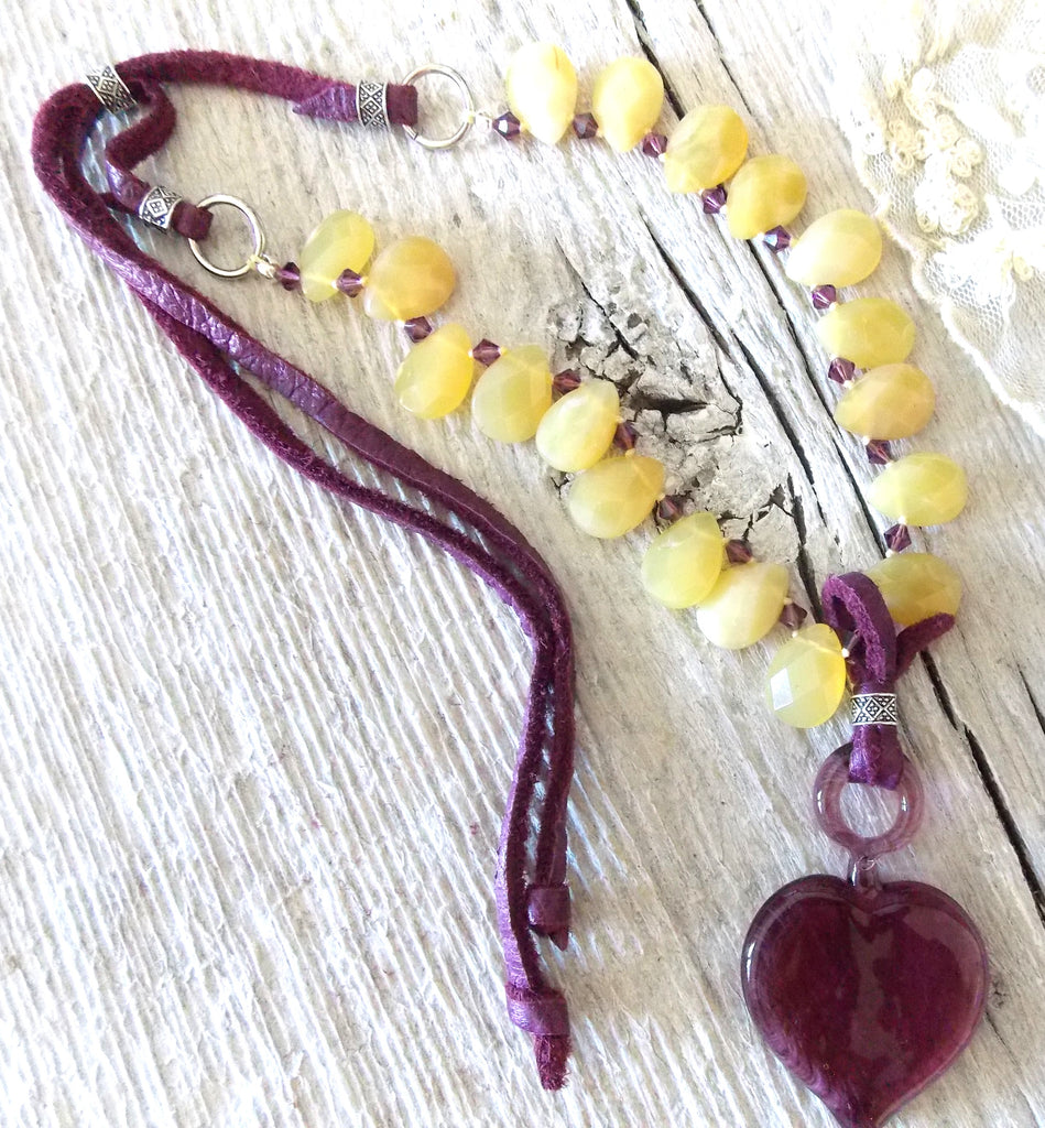 Large purple heart & keyhole glass pendant on supple deerskin leather suspended on the Opal hand-knotted strand