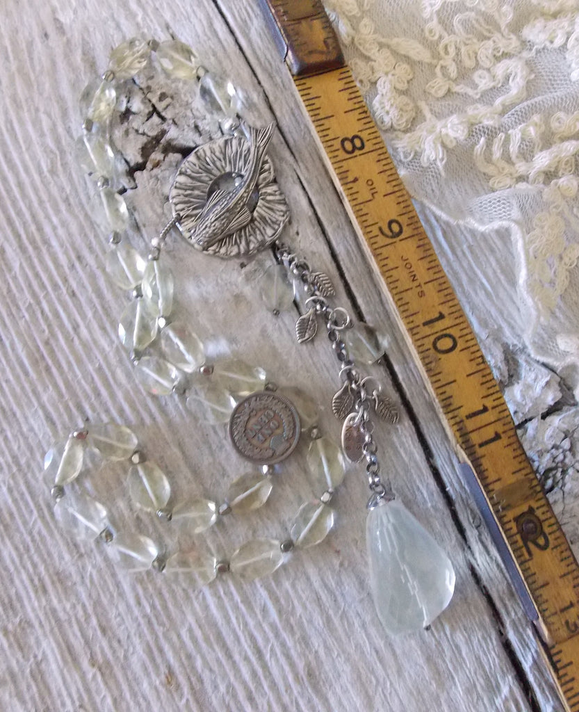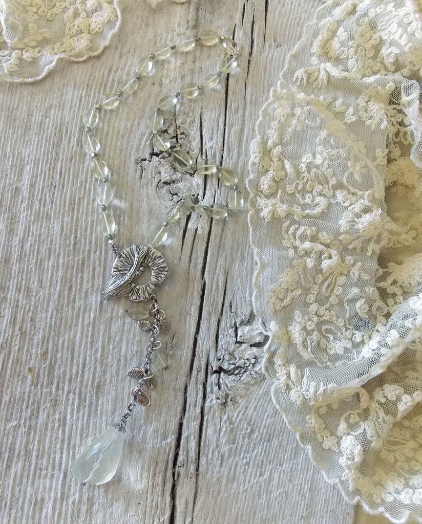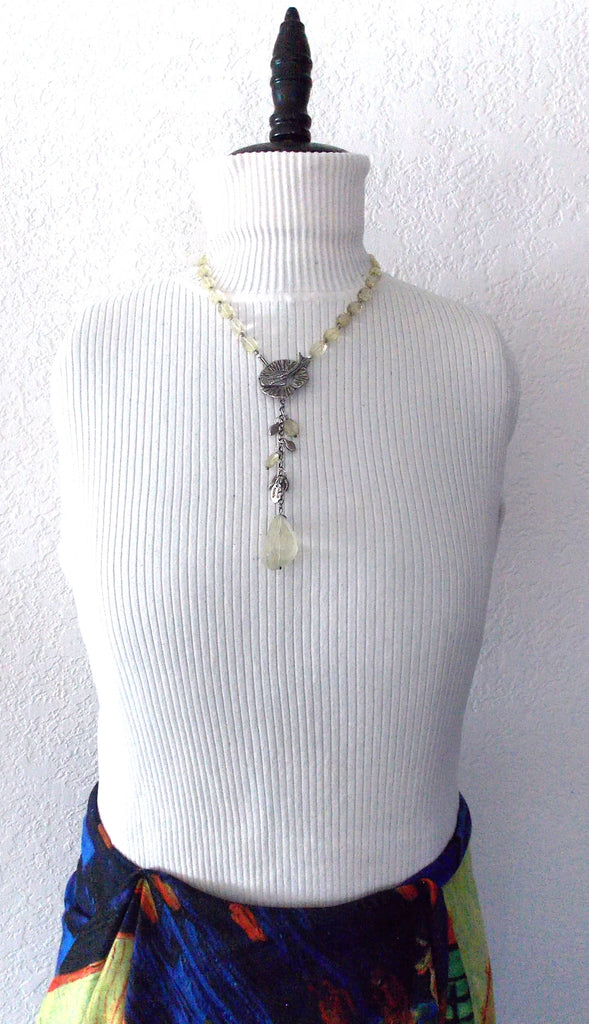 Suspended from the toggle is a pendant assemblage of Sterling Silver chain laden with Pineapple Quartz beads and silverplated leaf beads, and from which dangles a large Pineapple Quartz freeform nugget