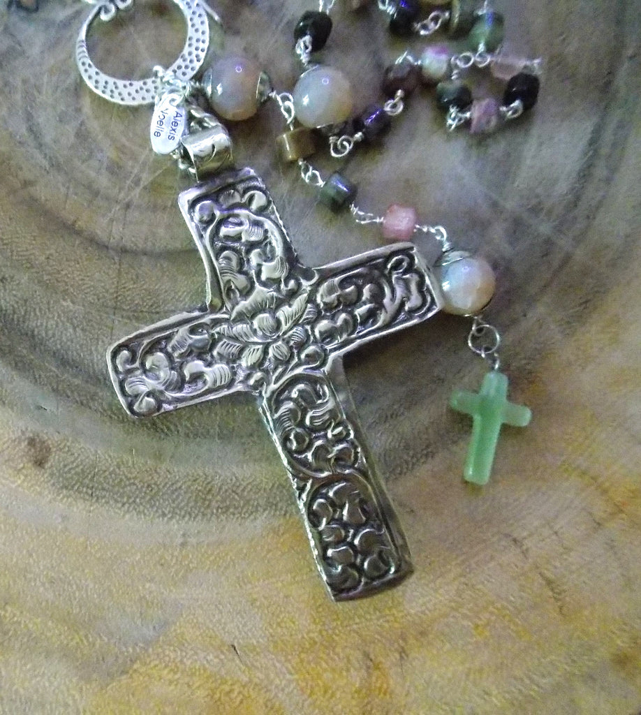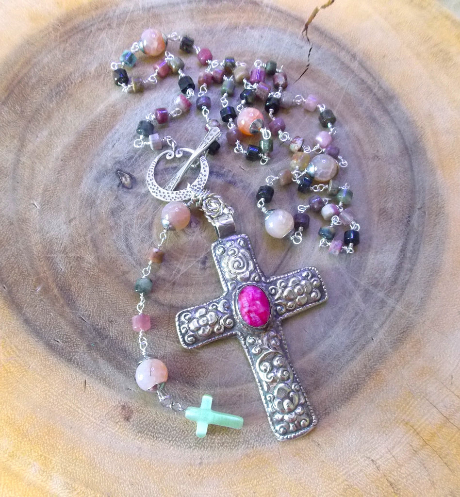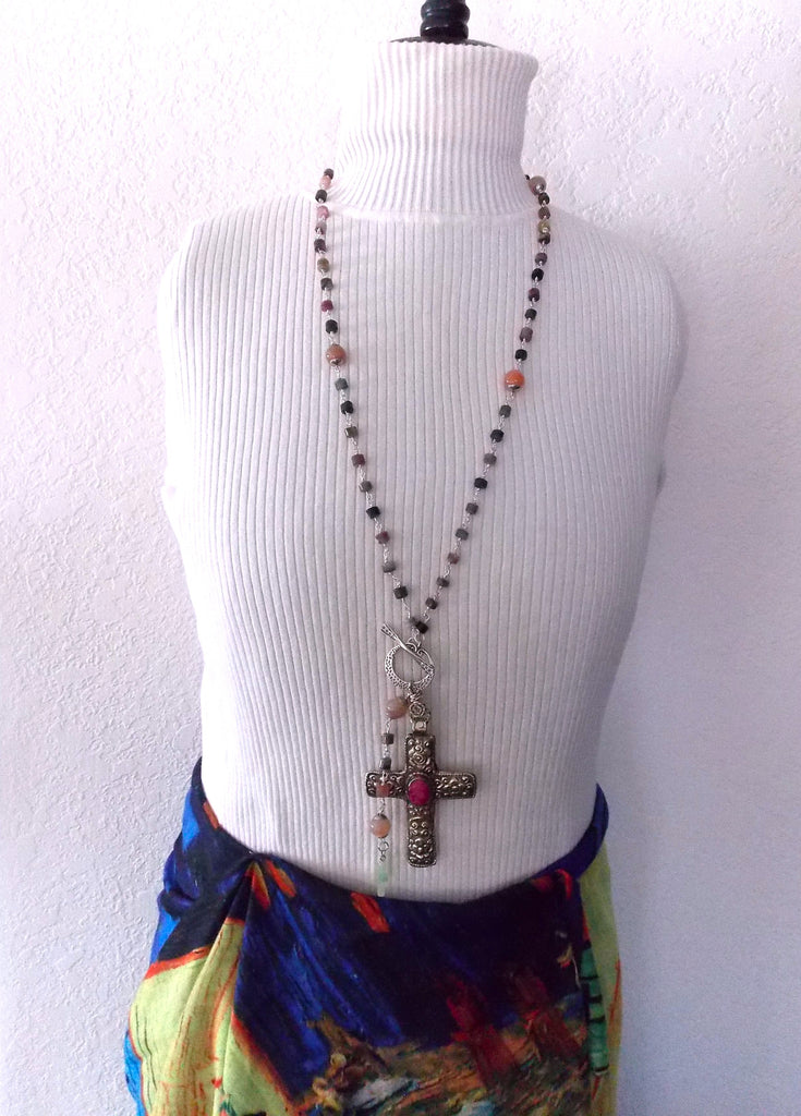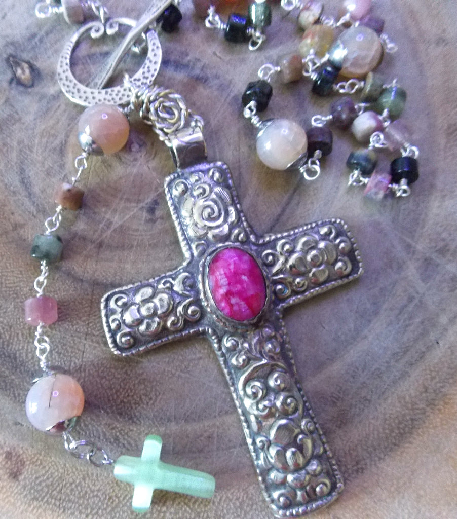 Tibet silver-clad Cross with Ruby inset, front & back of Cross of repousse-embossed with flowers/vine; flanked by cascade of Agate and tourmaline beads, wire-wrapped; held by silver toggle closure