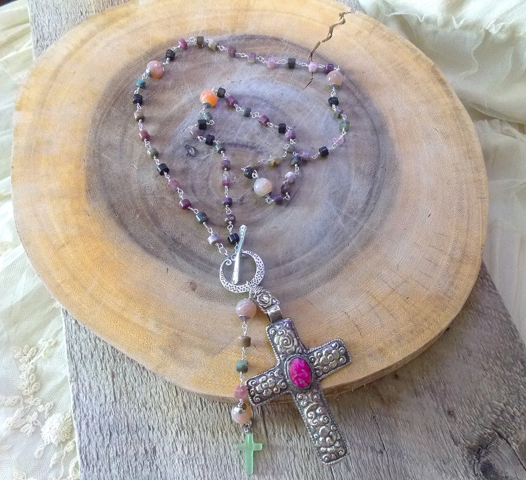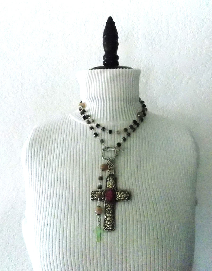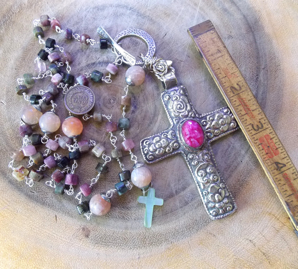 Tibet silver-clad Cross with Ruby inset, front & back of Cross of repousse-embossed with flowers/vine; flanked by cascade of Agate and tourmaline beads, wire-wrapped; held by silver toggle closure