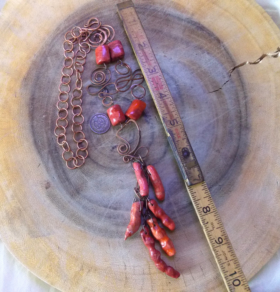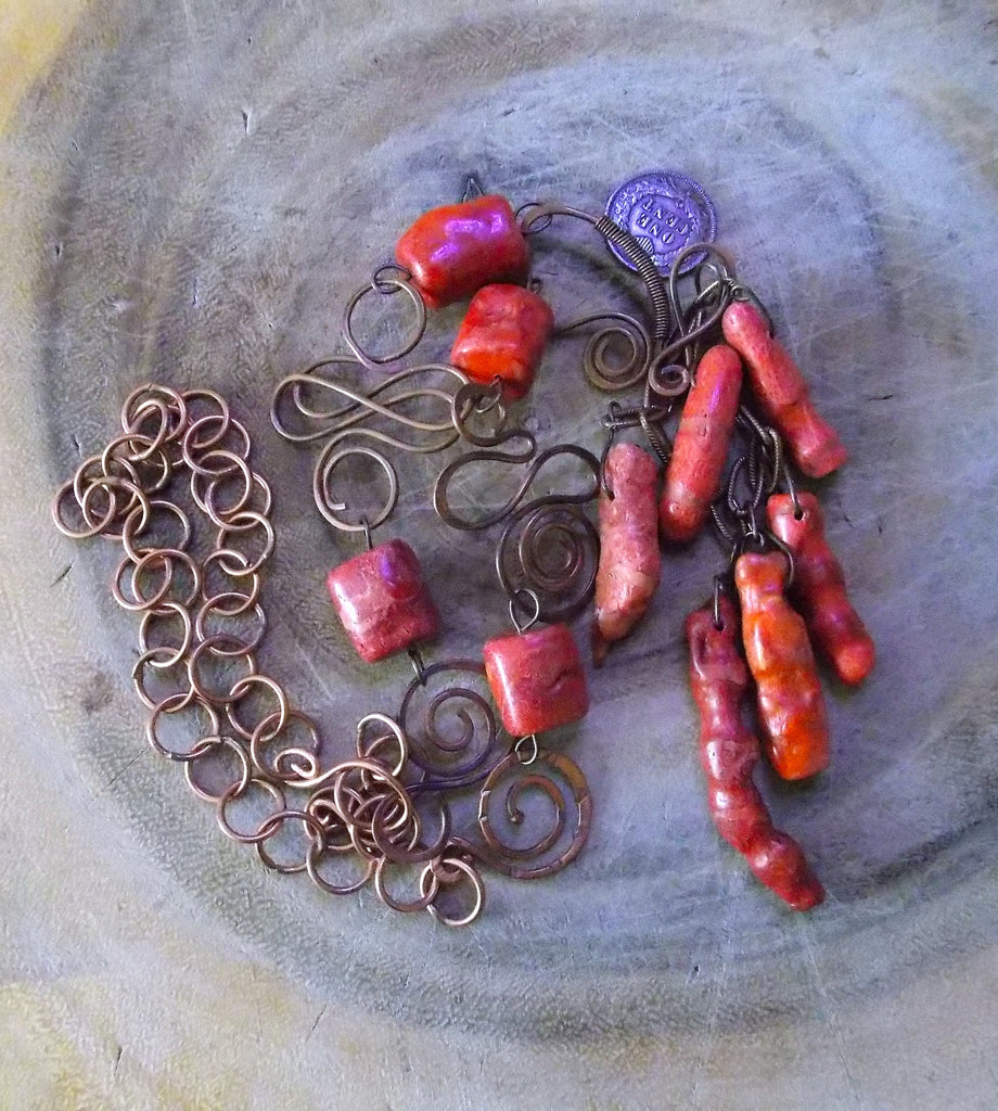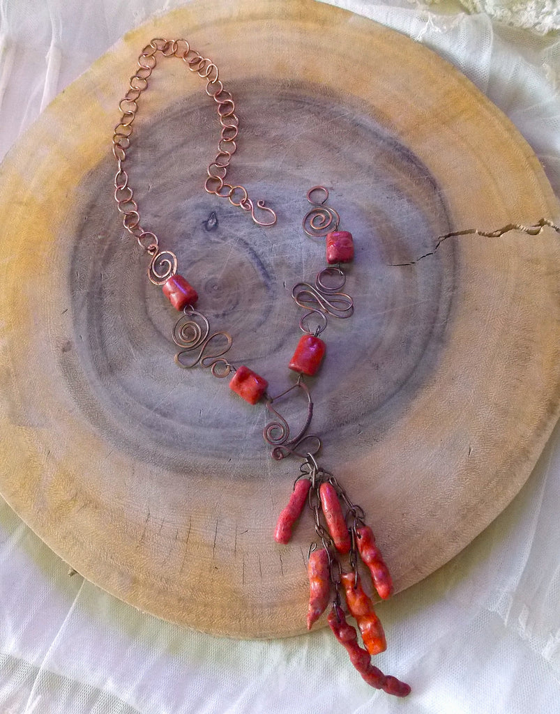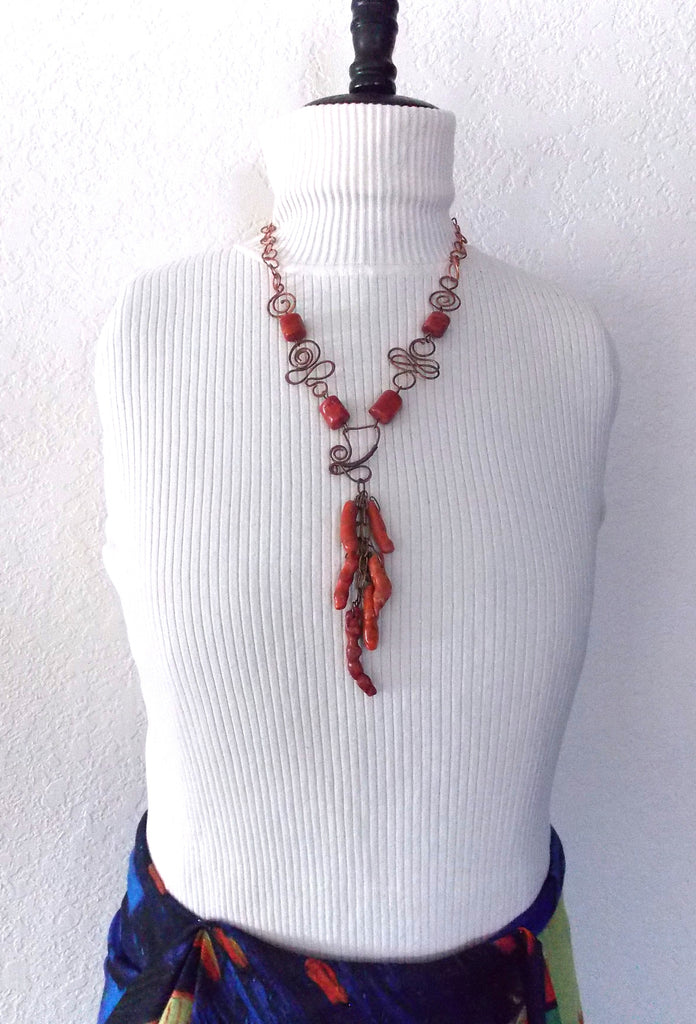 Copper handmade twirls hold large red Coral nuggets from which a cascade of Coral sticks hangs