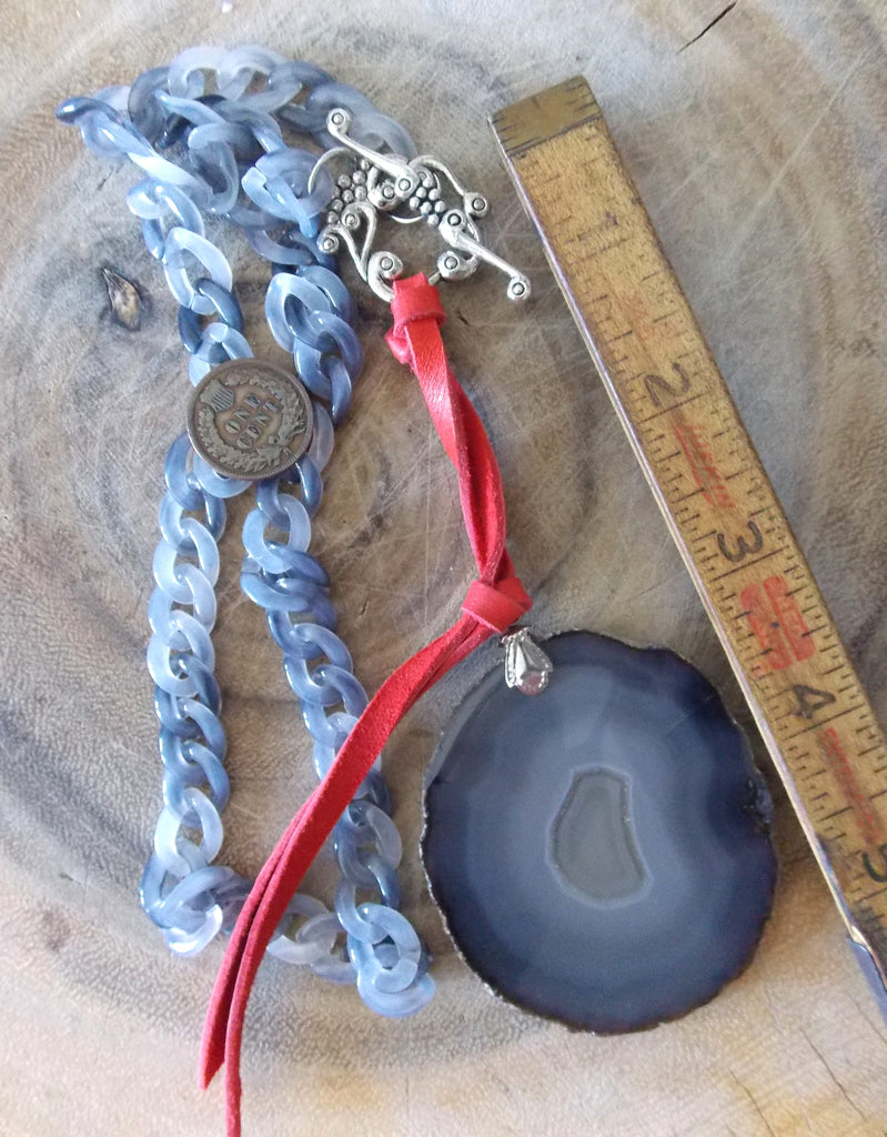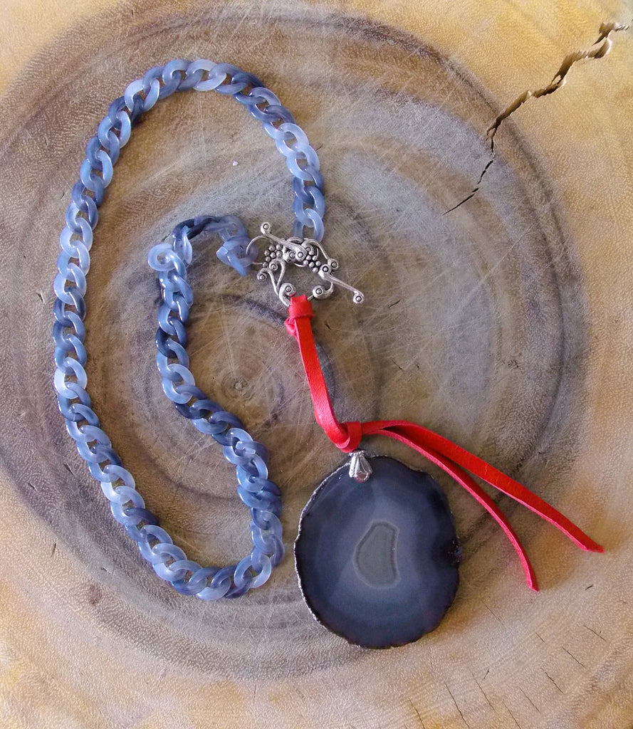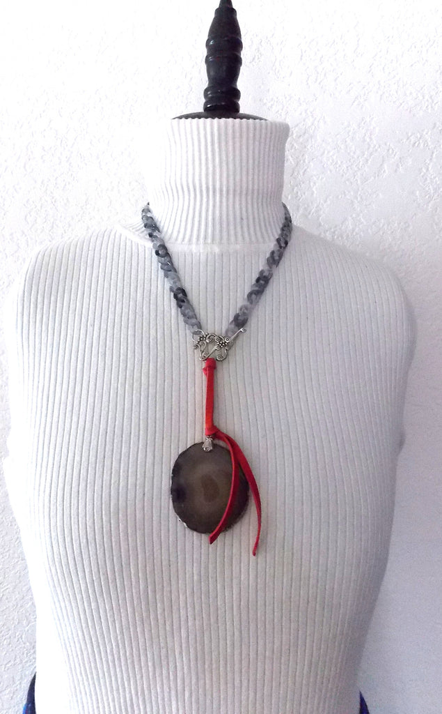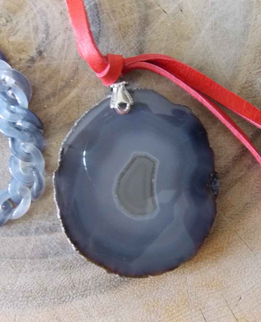 Grey Agate pendant secured with supple red deerskin leather onto toggle