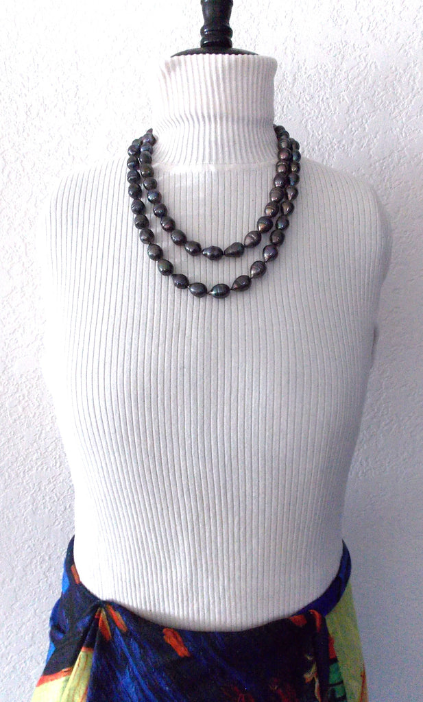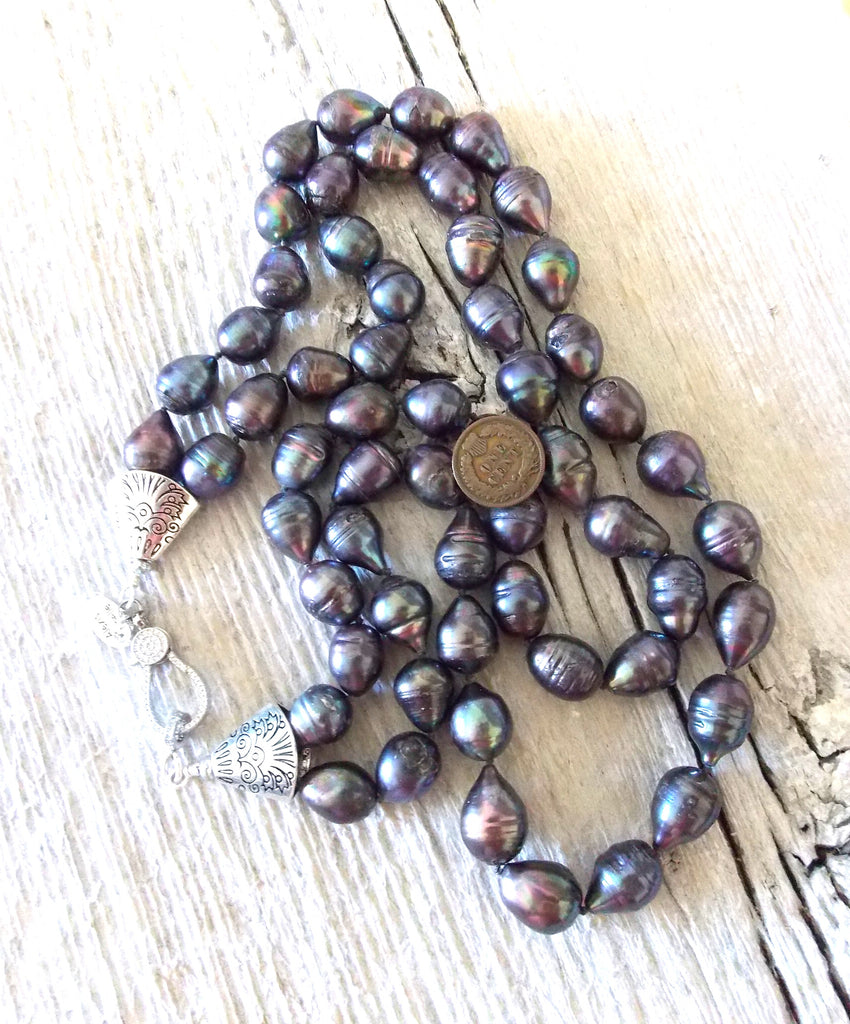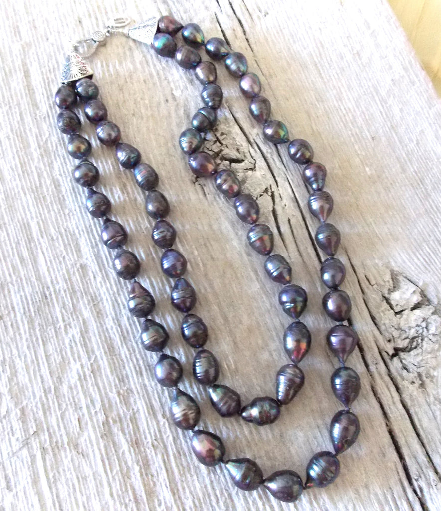 2-strand Graduated strand of large baroque iridescent slightly pear-shaped peacock Freshwater Pearls, some natural pocks adds to their beauty, hand-knotted, gathered onto Tibet-style cones