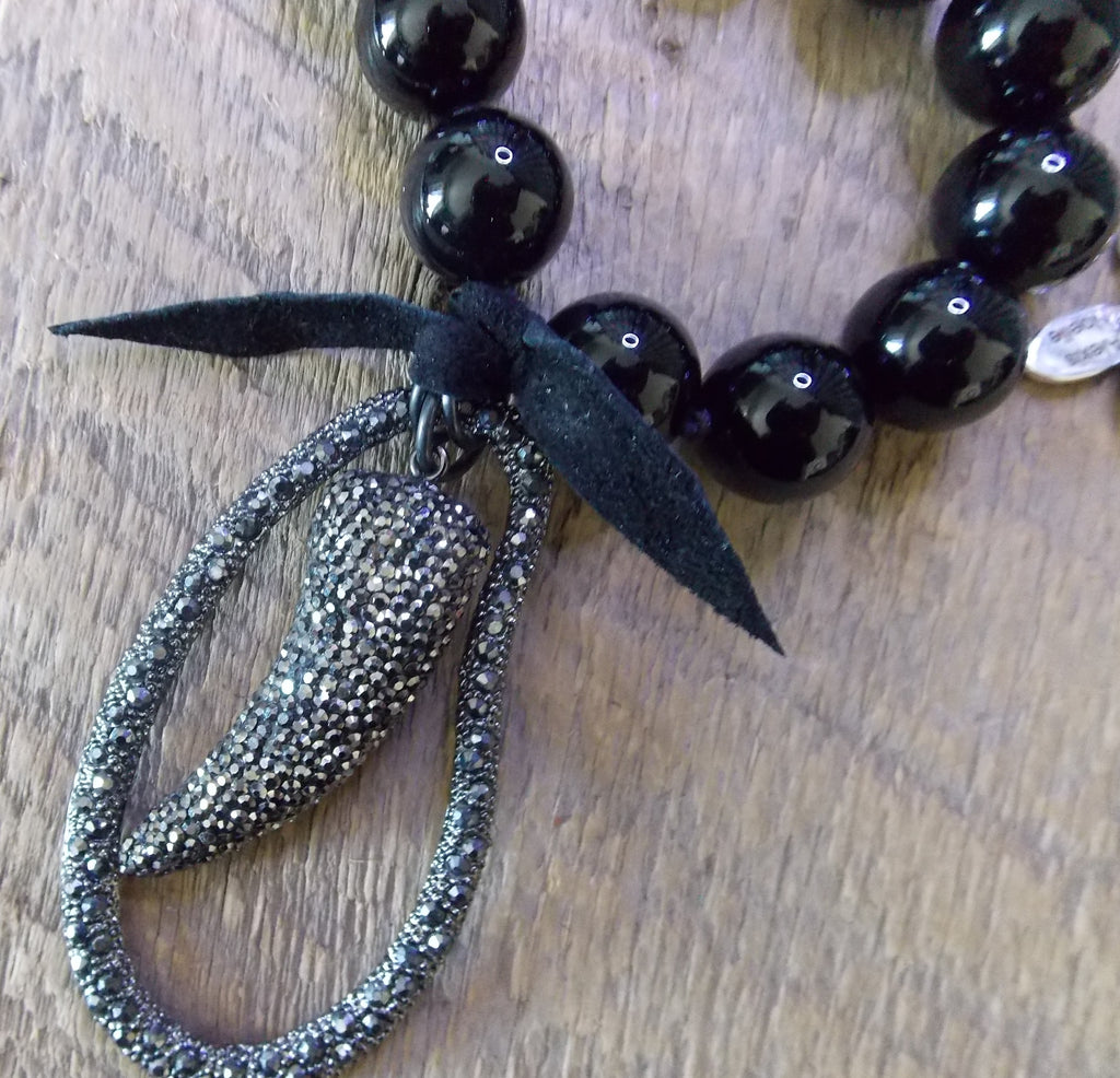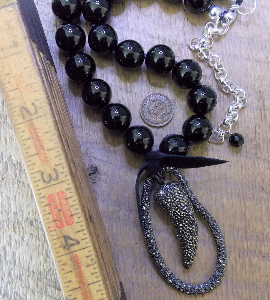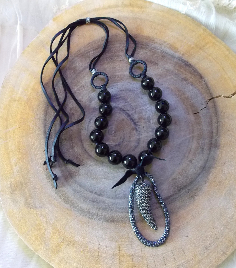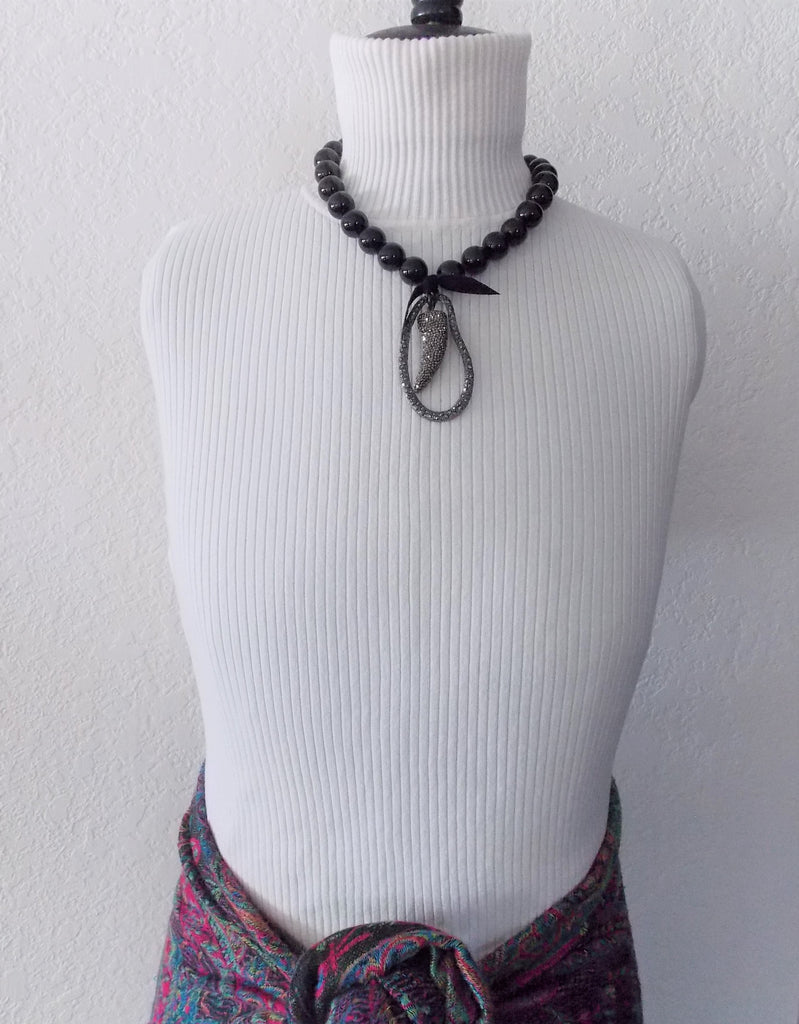 Black leather bow attaches pendant to the Onyx strand. Pendant is a large pear-shaped rhinestone-studded pendant and from which hangs a horn-shaped one studded which what looks like marcasite, otherwise, rhinestone