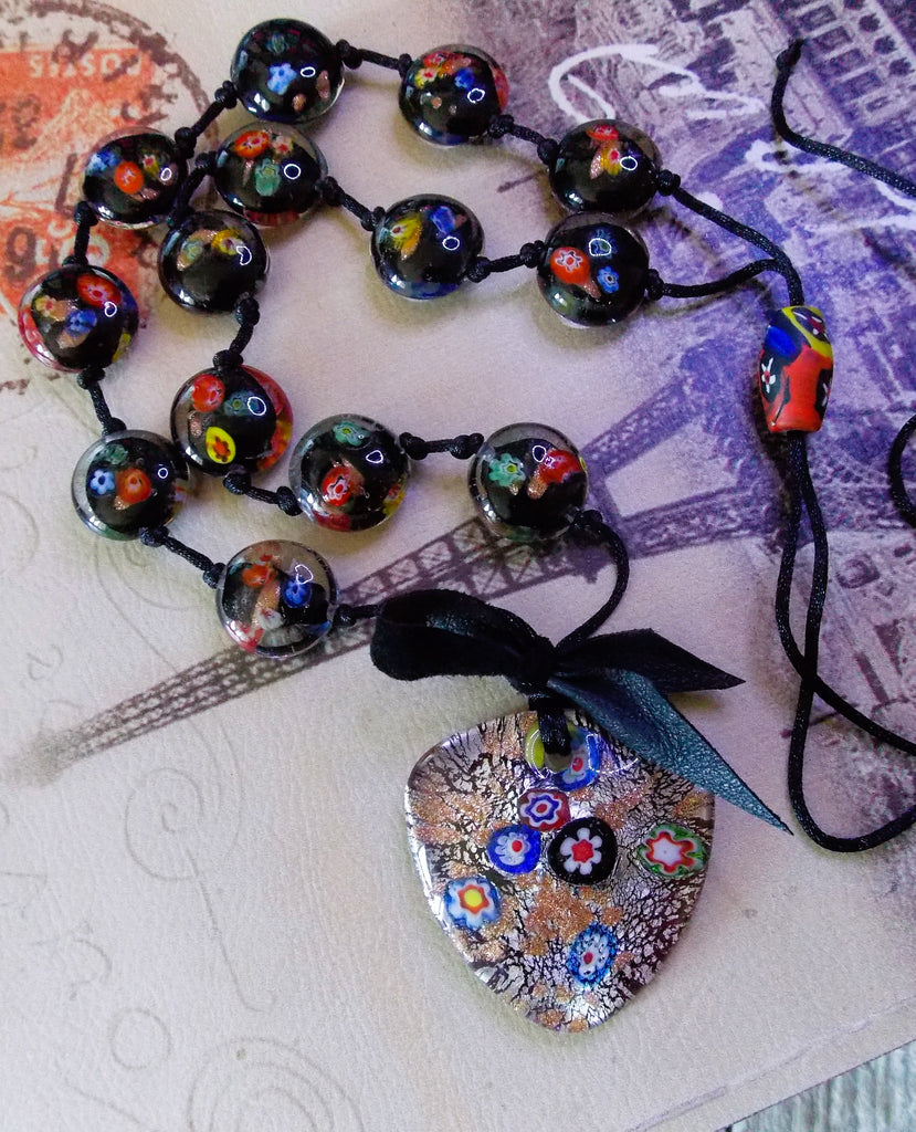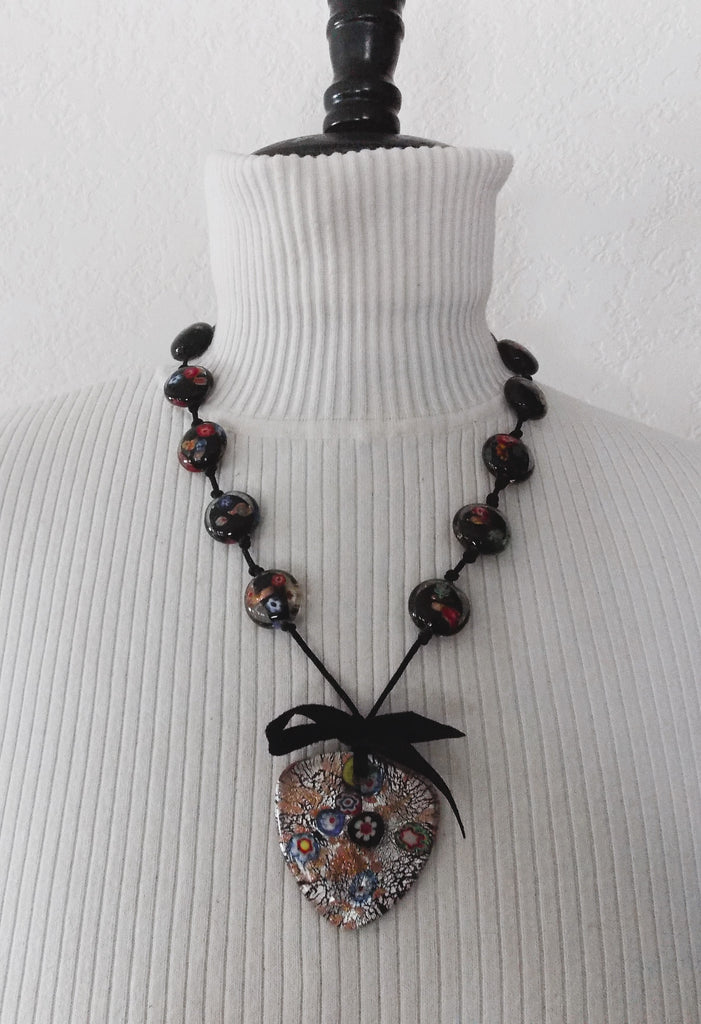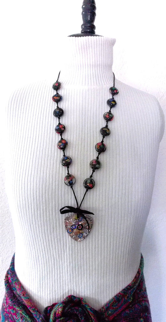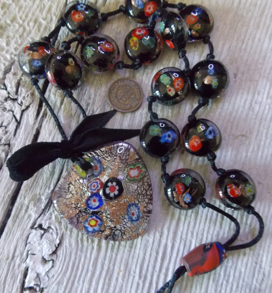 Hand-knotted strand of round disc shaped blown glass beads made with beautiful colors and designs, a clear base color with black and yellow inside, with shades of red, green and rose gold running throughout the bead.