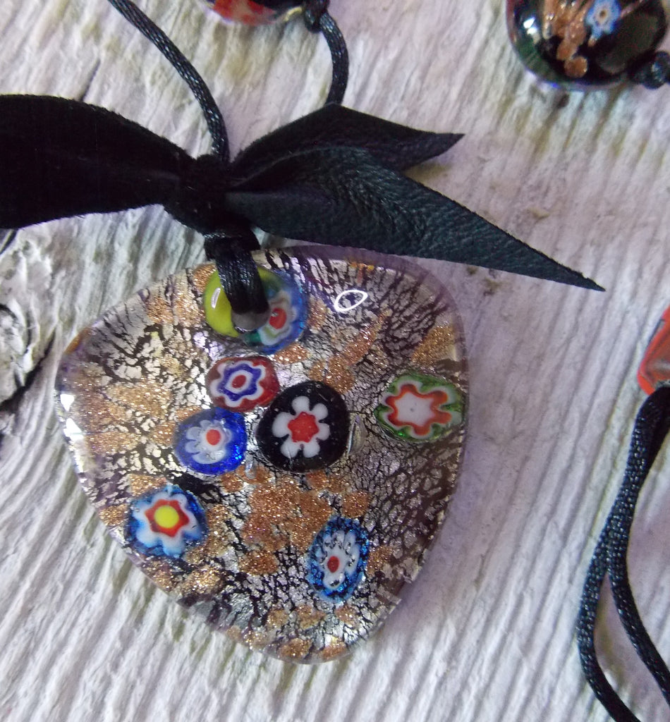 Pendant is an artist-created magnificent little piece of art with brilliant colors, fused dichroic glass with Millefiori canes