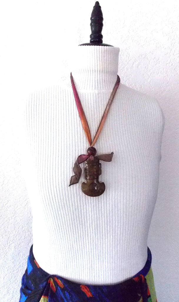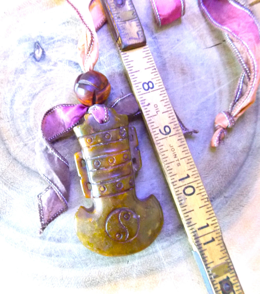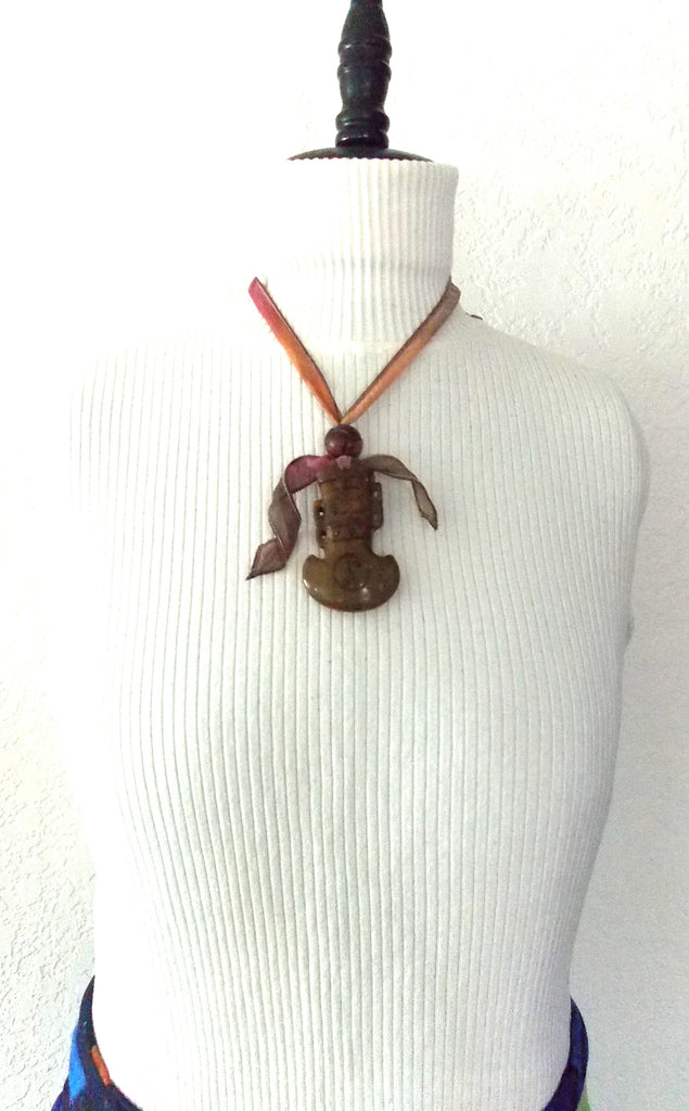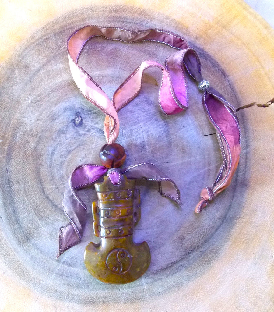 Artist-dyed ribbon suspends the Jade pendant; over the head; slide bead as closure allows different lengths